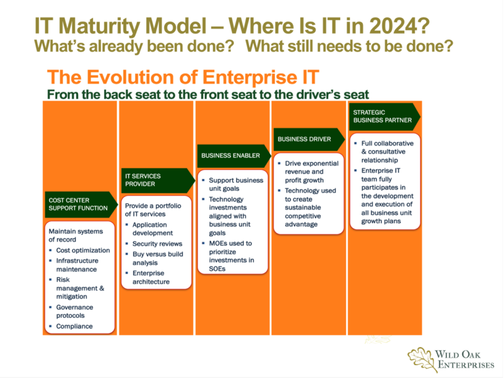 In order for IT to evolve from a cost center support function to a strategic business partner role, it requires demonstrating the multiple ways technology brings business value to the organization as illustrated on the chart below.