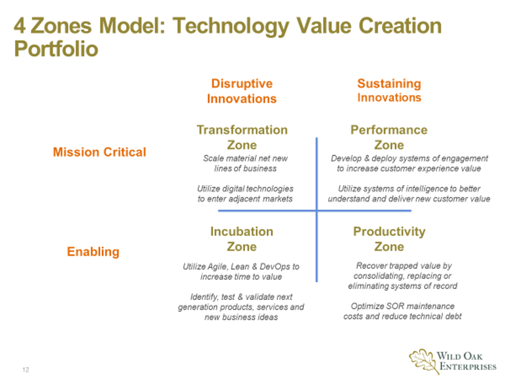 In order to demonstrate how digital technologies can directly increase revenues, margins, and profits, CIOs and their senior leadership teams have used the 4 Zones framework to align future IT investments with critical business outcomes. In collaboration with their internal business partners, they have constructed an IT Collaborative Investment Portfolio which allowed them to reach mutual agreement on how to segment and prioritize multiple IT investments by zone.