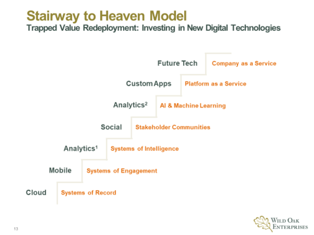 Many companies struggle deciding which new digital technologies to invest in to best enable the competitive performance of their businesses. The stairway to heaven model below has provided a foundational framework and step by step path forward for making these decisions. It has been very helpful in preventing companies from just chasing the next bright shinny object.