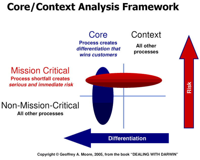 My brother, Geoffrey Moore, developed the core and context framework to draw clear distinctions between the different types of work employees are engaged in across any enterprise. As he states: